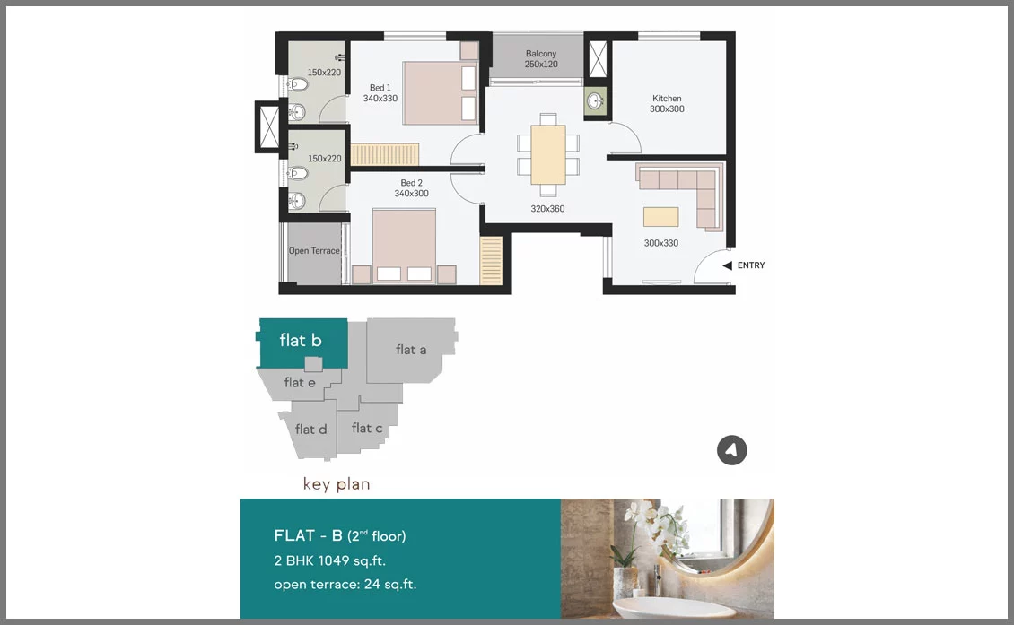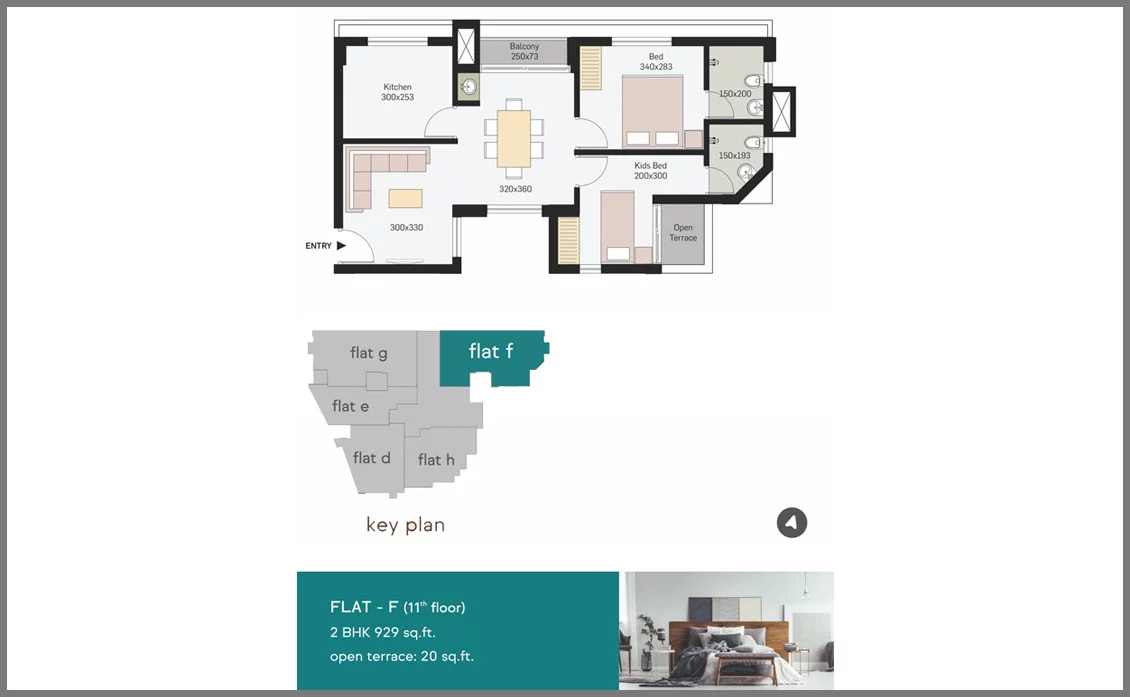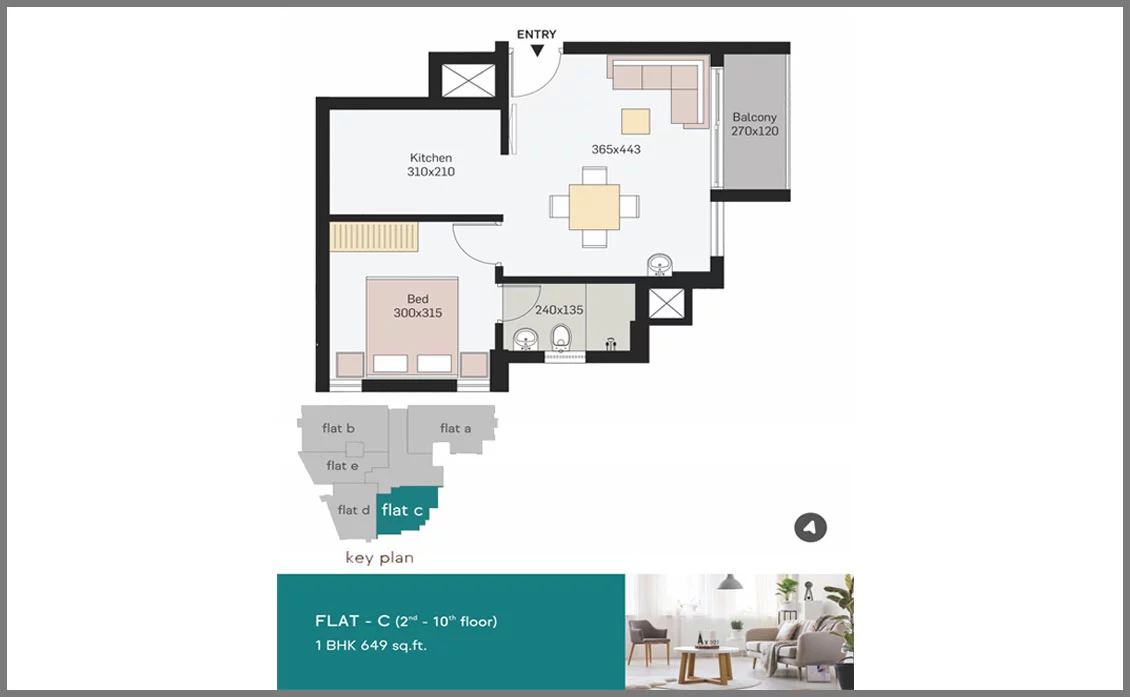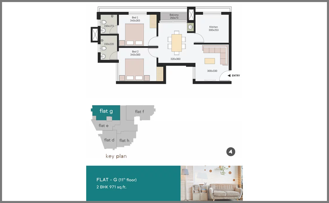 * Vitrified tiles for the entire apartment and rustic tiles for kitchen and balcony area.